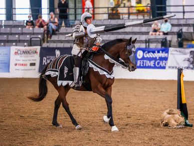 Ms. Jean and Mo-Mo performed a 5 minute routine to the music from the movie "A Knight's Tale." Mo-Mo learned to carry Ms. Jean in a full suit of armor, performed movement on cue to music and learned to joust (with fake lances) to finish the performance. Mo-Mo placed 6th in the nation in his 2020 class of Freestyle at the Thoroughbred Makeover.
